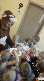 Sówki jako odpowiedzialne 5-latki przygotowały za pomocą Cioć wspaniałe obchody Dnia Pluszowego Misia.... Dzieci wiedzą jak dbać o swoje pluszaki, wiedzą, że te potrzebują wiele czułości i przytulasków. Misie czasem też potrzebują doktora - kiedy na przykład urwie się uszko lub rozpruje się łapka... Kochane Misie Sówek zostały zabrane na spacer w eskorcie 2 całkiem dorosłych Misiów, w których wcieliły się Ciocie:) Kochane Ciocie mają tyle pomysłów jak sprawić dzieciom radość... :) Sówki zrobiły też pracę plastyczną, która zdobi teraz nasze przedszkole a na deser......... był Tort ze składników lubianych przez wszystkie Misie.... żelkowo-piankowy Torcik, którym Misie podzieliły się z przedszkolakami :)